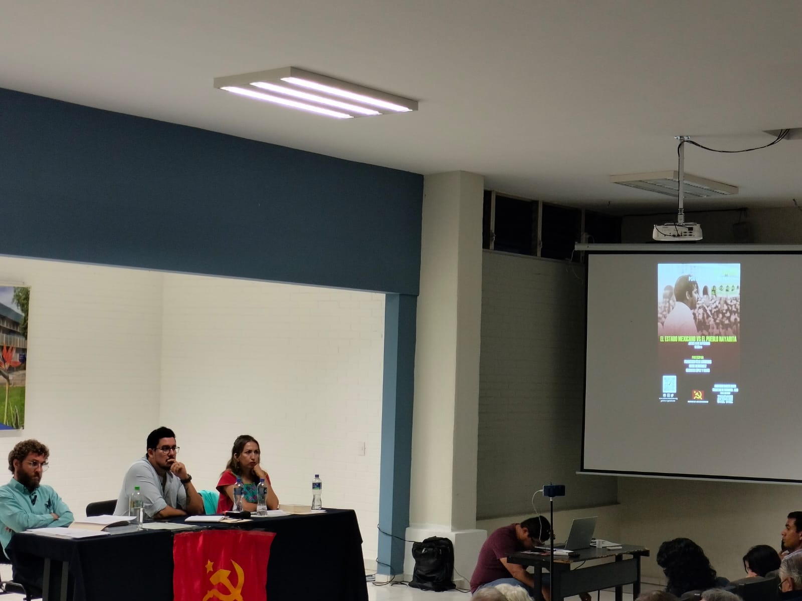 Uno a uno fueron llegando los asistentes al conversatorio: El Estado contra el pueblo nayarita. Algunos con paso lento, debido a los años de lucha sobre sus espaldas. Otros con paso rápido, ávidos de conocer más sobre la historia de nuestro pueblo. Al final casi se llena el bonito auditorio Carlos Marx.