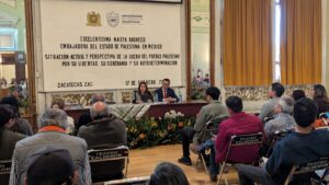 Esta semana la ciudad de Zacatecas recibió de nueva cuenta a la embajadora Palestina Nadya Rhaseed (Recientemente ya nos había visitado el año pasado) con una serie de actividades primero la embajadora asistió al Congreso local donde le fue dada la bienvenida oficial, después en dos jornadas apretadas realizó tres conferencias y además se llevó a cabo una pequeña marcha de solidaridad con el pueblo palestino.